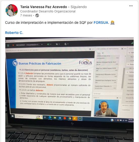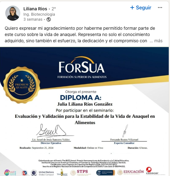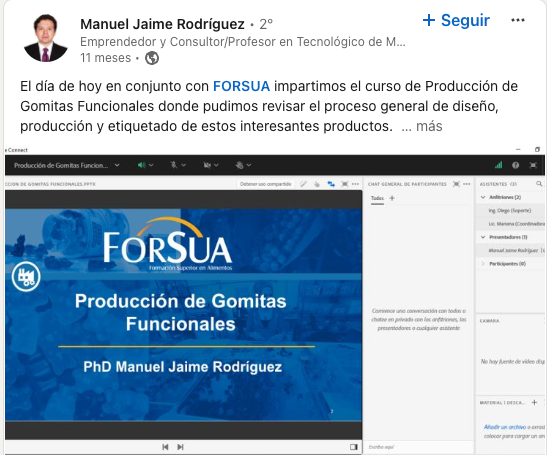 En general, el curso fue muy completo, abarco todo el proceso de la generación de la materia prima, la formulación hasta las pruebas piloto, producción y todo lo que implica realizar una formula e irla escalando por toda la planta, todos los análisis posteriores como los análisis sensoriales, trazabilidad, características fisicoquímicas, vida de anaquel, evaluación de peligros, Tocamos puntos muy específicos pero claves que nos ayudaran a aplicarlo.